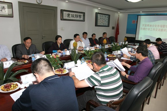 10月9日,深圳市文化市场行政执法总队总队长刘启鸣一行9人到北京市文化执法总队学习考察文化市场管理和“扫黄打非”工作经验。北京市文化市场行政执法总队总队长、市文化市场管理(“扫黄打非”)工作领导小组副组长兼办公室主任王英偶同志等与深圳考察组一行进行座谈交流。