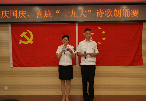 9月30日下午,市文化执法总队举行“庆国庆喜迎十九大”诗歌朗诵比赛,十个支部代表队进行了激烈的角逐,执法三队党支部代表队获得一等奖;机关党委、人事处党支部、宣传和投诉举报事务中心党支部代表队获得二等奖;办公室(队志办)装财处党支部、信息中心党支部、法制处执法二队党支部代表队获得三等奖。