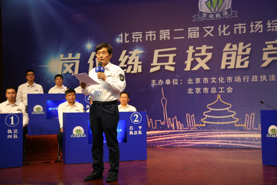 市文化执法总队党组书记、总队长李树江在致辞中充分肯定了全市文化执法各部门立足岗位、勤学苦练的参与热情和工作措施;全面总结了此次岗位练兵技能竞赛活动对提高队伍素质能力、提升执法办案水平所起到的巨大推动作用;要求全市文化执法系统继续保持在此次活动中养成的良好学风、扎实作风,规范执法行为,拓展执法领域,始终展现出首都文化执法队伍"政治坚定、行为规范、业务精通、作风过硬"的优秀形象,为全国文化中心建设、首都文化繁荣发展,做出更大的贡献,力争在全国的比赛中取得更加优异的成绩!