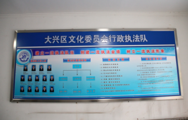 大兴区文委执法队自开展“创先争优暨民主评议政风行风”活动以来,多次召开专题会议,认真学习《文化部关于加强文化市场综合执法制度建设的通知》精神,同时着力构建有利于队伍建设的制度体系。目前,区文委执法队已经制定了《举报受理制度》、《文化市场日常巡查制度》、《行为规范十不准》等多种制度以及科室岗位职责,并把这些制度规范和岗位职责公布上墙,以便于开展社会监督。
