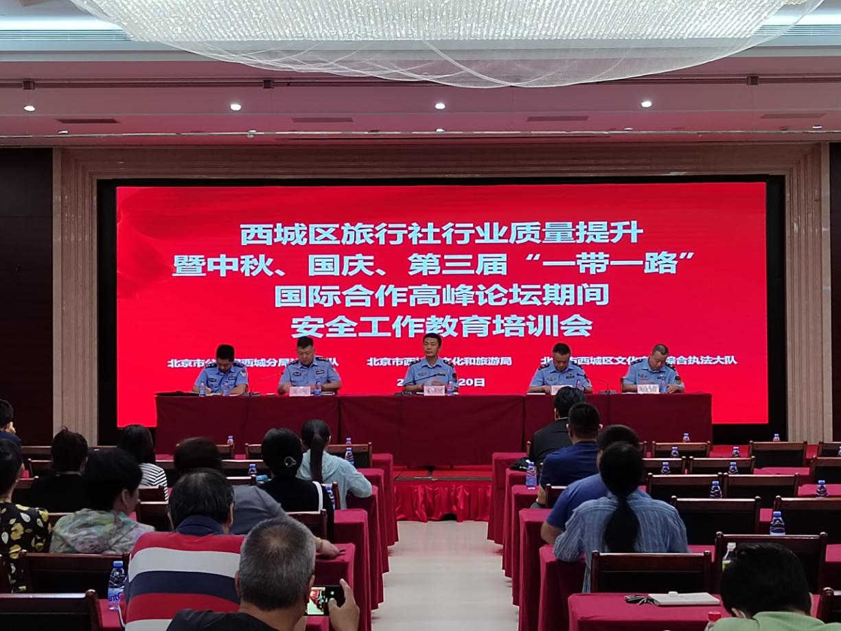 为做好西城区中秋、国庆假期旅游市场服务保障工作,确保第三届“一带一路”国际合作高峰论坛在京胜利召开,西城区文化市场综合执法大队召开旅行社行业质量提升暨中秋、国庆、第三届“一带一路”国际合作高峰论坛安全工作教育培训会。