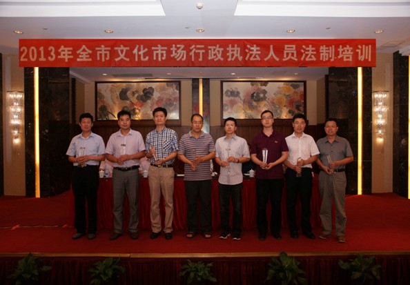 7月17日,市文化执法总队召开2013年全市文化执法人员法制培训会。会议表彰了2012年全市文化执法办案标兵,并邀请文化部文化市场司执法监督处负责人进行专题授课。市文化执法总队党组书记张珠同志出席并作了讲话。市、区两级文化执法人员共210人参加。