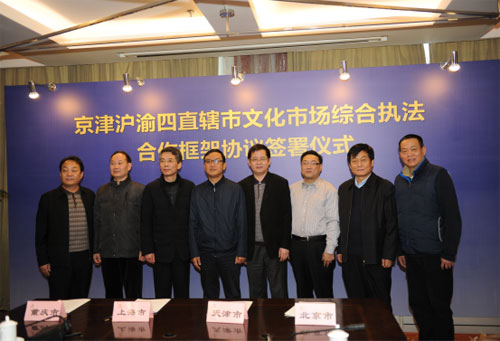 1月19日,北京市文化市场行政执法总队牵头召开“2016年京津沪渝四直辖市文化执法合作联席会议”,北京、天津、上海、重庆四直辖市文化执法总队一同签订了《京津沪渝文化市场综合执法合作框架协议》。文化部市场司副司长刘强、市委宣传部副部长赵卫东出席签约仪式并讲话。