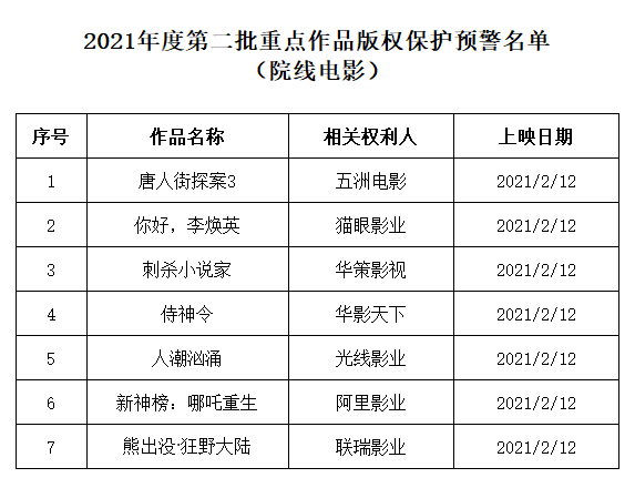 2月8日,国家版权局公布了2021年度第二批重点作品版权保护预警名单。2月9日,北京市文化市场综合执法总队三支队向抖音、百度、爱奇艺、优酷等20余家网站及网络服务提供商进行了预警通知。