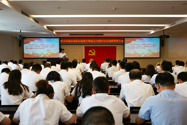 8月23日下午,北京市文化市场行政执法总队召开迎接中华人民共和国70周年安全保障誓师大会,会议要求:一是要进一步提高政治站位,树牢“四个意识”,做到“两个维护”,确保文化安全,防止“跑冒滴漏”现象发生。二是要结合年度“扫黄打非”各类专项行动要求,持续加大预警监测研判力度,深入清查印制销售侵权盗版非法出版物行为,从严整治利用网络直播、“两微一端”等渠道传播有害文化产品,严厉打击“黑广播”及非法卫星地面接收设施,加强对网吧、影院、文化娱乐等人员密集场所和全市重点文保单位安全生产监管,联合市相关部门加强机场车站、重点景区周边和游客集散区域巡查执法,依法治理旅游市场“六黑”乱象。三是要突出作为首都文化卫士的“枪尖子”“刀把子”职责,用以打开路、以打树威、打防并举的措施,肩负起捍卫首都政治安全和文化安全的重大责任,在迎国庆服务保障工作中体现出忠诚、干净、担当的“文化铁军”精神风貌。